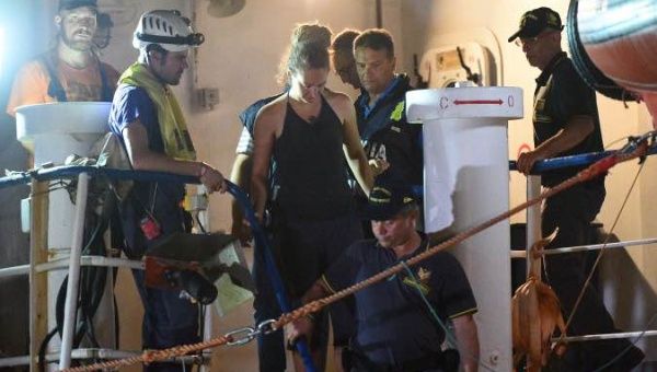 Στα πλάνα της κρατικής τηλεόρασης RAI η νεαρή καπετάνισσα του πλοίου Κάρολα Ρακέτε φαίνεται να μεταφέρεται από τις αστυνομικές δυνάμεις. Η RAI τόνισε ότι συνελήφθη γιατί «προέβαλε αντίσταση σε ένα πλοίο του Πολεμικού Ναυτικού». Πρόσθεσε ότι βρίσκεται αντιμέτωπη με ποινή έως και δέκα χρόνια κάθειρξη.