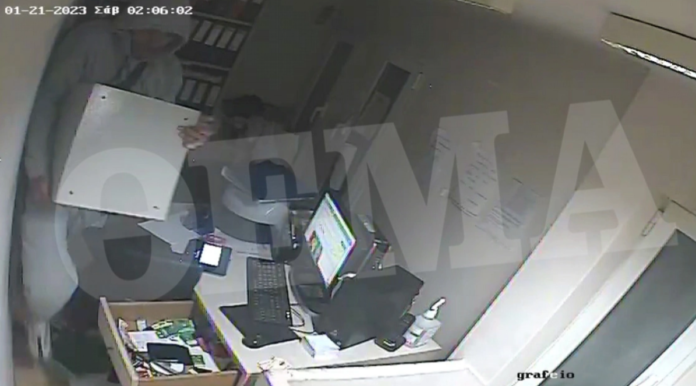 Στα αποκλειστικά πλάνα του protothema.gr, φαίνεται ο ένας δράστης να σπρώχνει με το σώμα του την πόρτα την ώρα που ο συνεργός του την τραβά και την ανοίγει με τα χέρια.