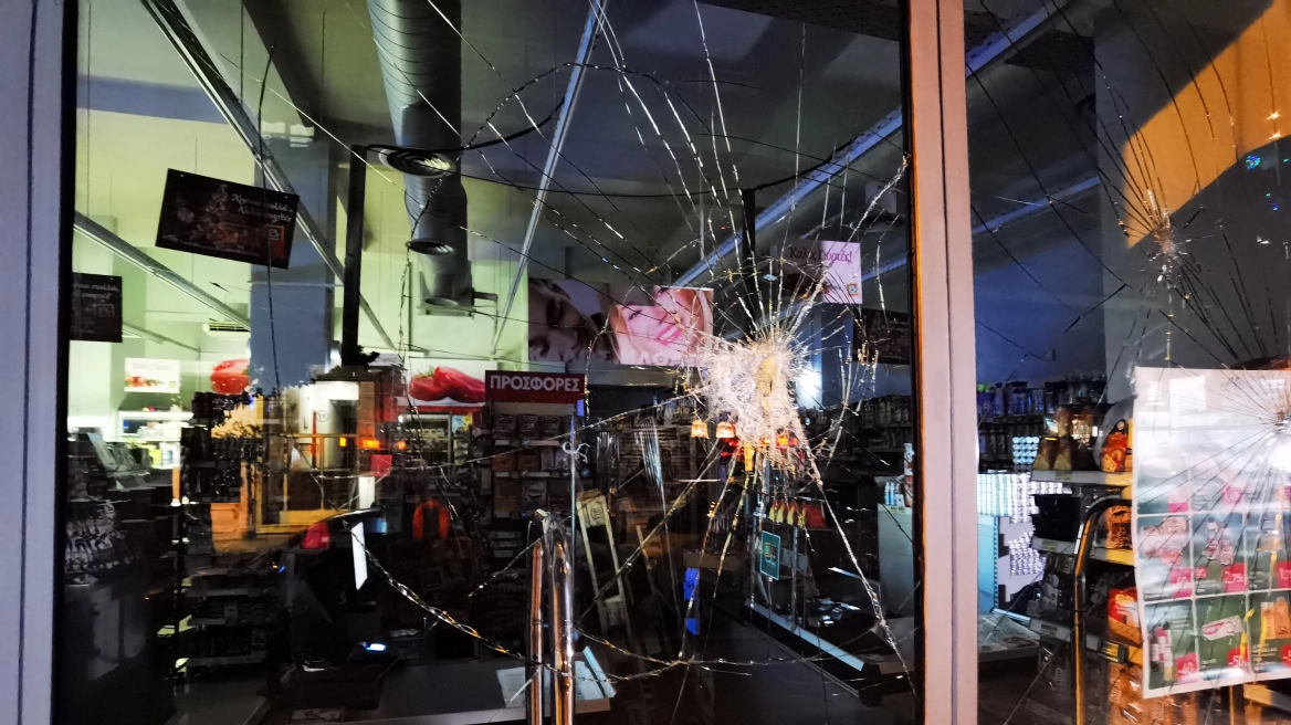 Σε λιγότερο από δύο λεπτά, οι νεαροί προκάλεσαν ζημιές στην πρόσοψη ενός καταστήματος κινητής τηλεφωνίας και ενός σούπερ μάρκετ ενώ από τη μανία τους δεν γλίτωσαν τα 3 ATM της περιοχής.