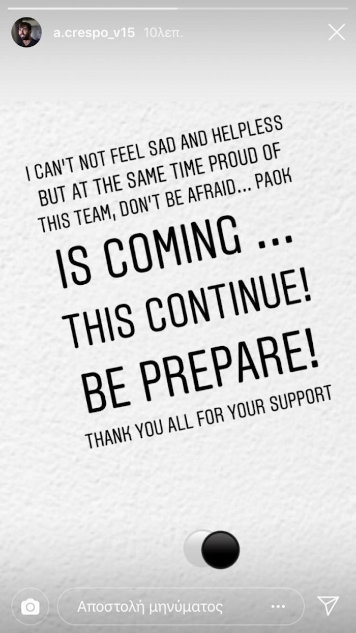Εγραψε: «Δεν μπορώ να νιώσω λυπημένος και αβοήθητος, αλλά την ίδια στιγμή είμαι περήφανος για αυτή την ομάδα. Μην φοβάστε… ο ΠΑΟΚ έρχεται. Αυτό συνεχίζεται… Να είστε έτοιμοι. Σας ευχαριστώ όλους για την υποστήριξη».