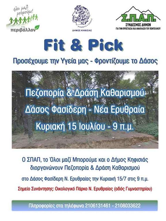 Την Κυριακή 15 Ιουλίου κάνουμε FitPik στο δάσος Φασίδερι στη Νέα Ερυθραία.Περπατάμε αθλούμαστε και καθαρίζουμε σε μια κυκλική διαδρομή 4 χιλιομέτρων στο καταπράσινο δάσος Φασίδερι.