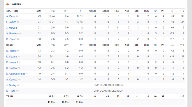 Από την άλλη, ο ΛεΜπρόν πραγματοποίησε μεγάλη εμφάνιση με 37 πόντους, 8 ριμπάουντ, 7 ασίστ και 3 κλεψίματα ενώ πολύ καλός ήταν κι ο Ντέιβις με 30 πόντους και 9 ριμπάουντ.