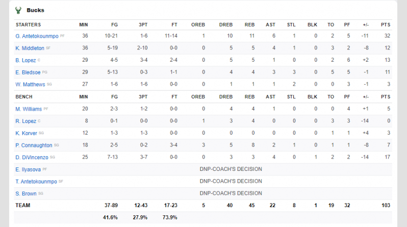 Εκεί που κρίθηκε το ματς ήταν στην τρίτη περίοδο όπου οι Λέικερς κυριάρχησαν, προηγήθηκαν ακόμη και με 15 πόντους (85-70) κι έφτασαν τελικά στη νίκη με 113-103. Ο Γιάννης έκανε τα πάντα στα 36 λεπτά που έμεινε στο παρκέ αφού κατέγραψε 32 πόντους με 10/21 σουτ (1/6 τρίποντα), 11/14 βολές, 12 ριμπάουντ, 6 ασίστ και 1 κλέψιμο. Αλλά ήταν μόνος.