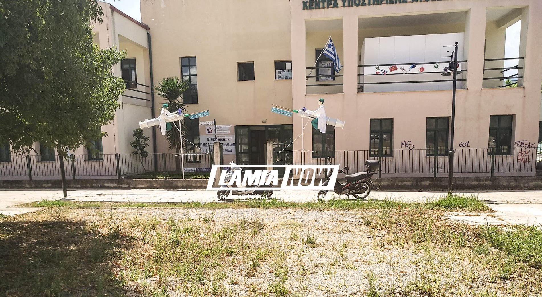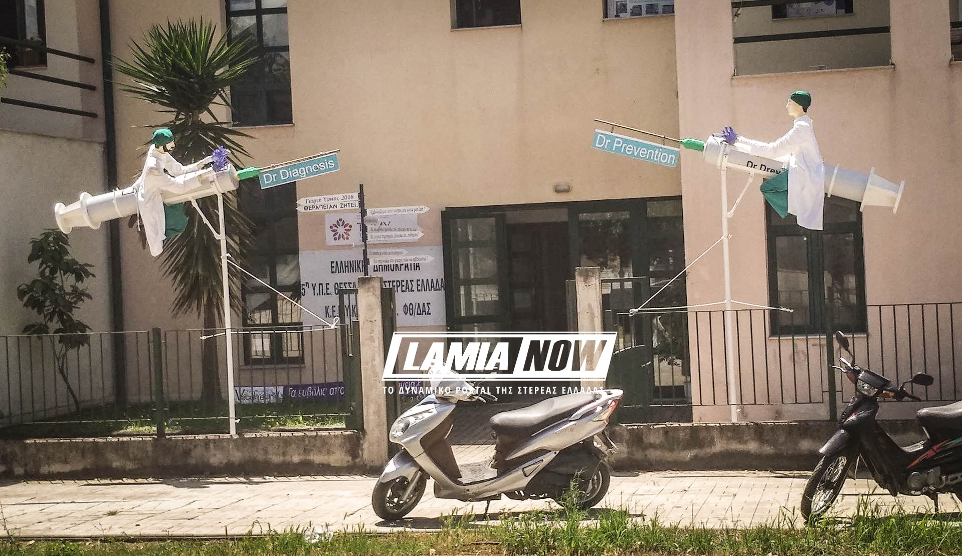 Ξαφνιάστηκαν οι Λαμιώτες περνώντας από την χρήσιμη κατά τα άλλα νέα δομή υγείας της Λαμίας (στο κτίριο που στεγάζεται και το ΚΕΦΙΑΠ, στο κομμάτι που έχει παραχωρήσει το Νοσοκομείο Λαμίας όπισθεν 2ου Γυμνασίου – Λυκείου) αφού το θέαμα δύο ιπτάμενων γιατρών να πετάνε πάνω από μια κρατική υπηρεσία, καβάλα σε ενέσεις, είναι σίγουρα ανέλπιστο και μάλλον τραγελαφικό.