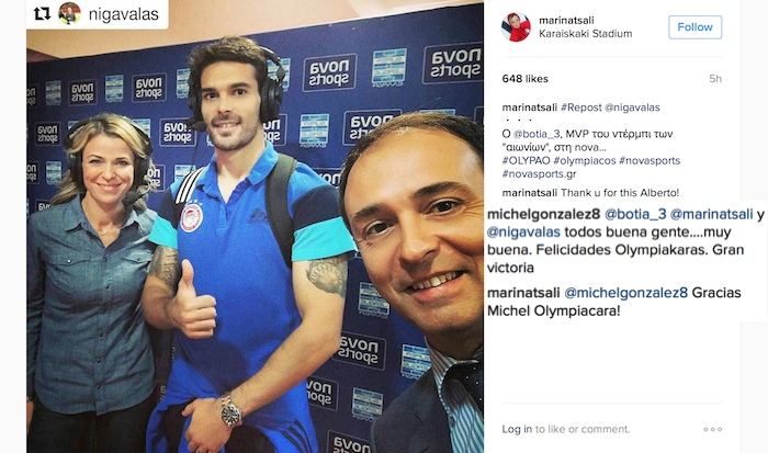 Ο Ισπανός τεχνικός μετέφερε τα συγχαρητήρια του για τη νίκη των «Πειραιωτών» στο ντέρμπι των «αιωνίων», σχολιάζοντας τη φωτογραφία που ανέβασε η μεταφράστρια του Ολυμπιακού, Μαρίνα Τσαλή στο instragram μαζί με τον Μποτία και τον ρεπόρτερ, Νίκο Γαβαλά, πριν από τη ζωντανή σύνδεση στην εκπομπή «Παίζουμε Ελλάδα» των καναλιών novasports.