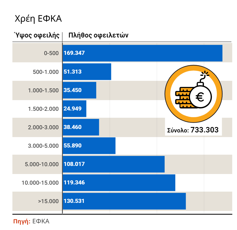Σύμφωνα με τα αναλυτικά στοιχεία που αποκαλύπτει το Capital.gr, από τους 733.303 οφειλέτες, οι 169.347 χρωστούν ως 500 ευρώ, ενώ στις επόμενες κλίμακες οι οφειλέτες  με περισσότερα χρέη είναι λιγότεροι. Με χρέη από 1.500 ευρώ ως 2.000 ευρώ είναι 24.949 επαγγελματίες, αγρότες και αυτοαπασχολούμενοι, με χρέη από 2.000 ευρώ ως 3.000 ευρώ είναι 38.460 οφειλέτες. Χρέη από 3.000 ευρώ ως 5.000 ευρώ έχουν 55.890 οφειλέτες, ενώ χρέη άνω των 15.000 ευρώ έχουν 130.531 οφειλέτες.