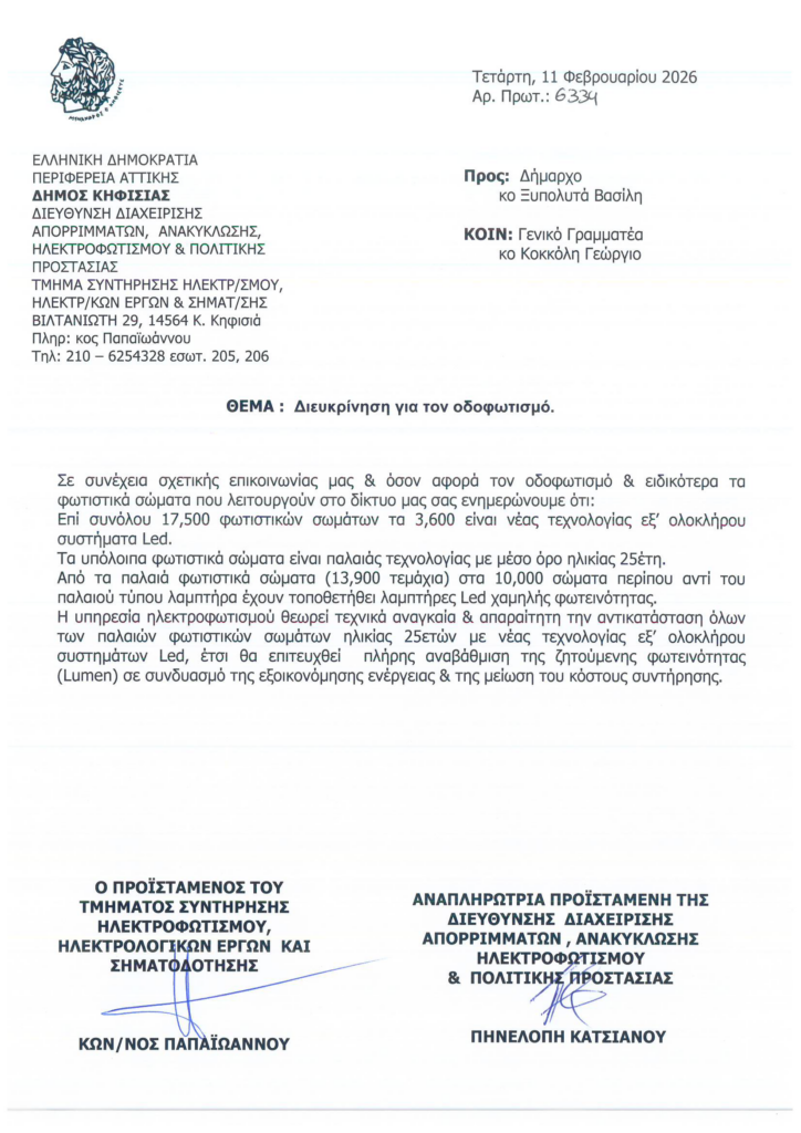 Η πραγματικότητα, όπως αποτυπώνεται στα επίσημα στοιχεία της επιστολής της αρμόδιας υπηρεσίας με αριθμό πρωτοκόλλου 6334 και ημερομηνία 11/2/2026, είναι ότι το δημοτικό δίκτυο ηλεκτροφωτισμού παραμένει κατά ποσοστό 80% παλαιάς τεχνολογίας και χρήζει συνολικής αναβάθμισης. Από τα στοιχεία που παρατίθενται προκύπτει ότι 13.900 φωτιστικά σώματα του δημοτικού δικτύου έχουν μέσο όρο ηλικίας 25 έτη και η αρμόδια υπηρεσία εισηγείται την αντικατάστασή τους.
