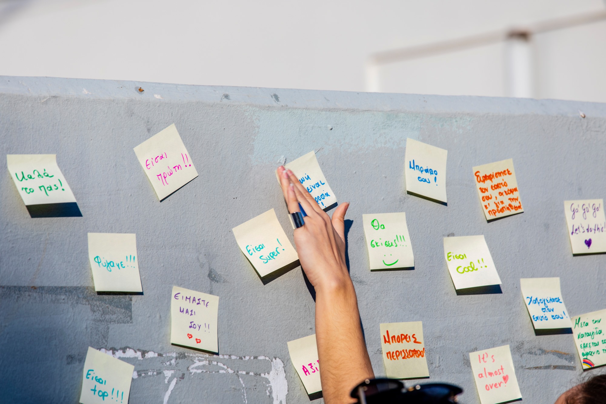 Στα δύο εξεταστικά κέντρα, το 3ο Λύκειο Κηφισιάς και το Λύκειο Ν. Ερυθραίας οι μαθητές και οι γονείς τους συνάντησαν μια πρωτότυπη «αφισοκόλληση» από post- it, χαρτάκια με θετικά μηνύματα όπως: «Καλή επιτυχία», «Μη σταματάς να ονειρεύεσαι», «Αξίζω κάθε μέρα», «Πάμε δυνατά!», «Είσαι μοναδικός»