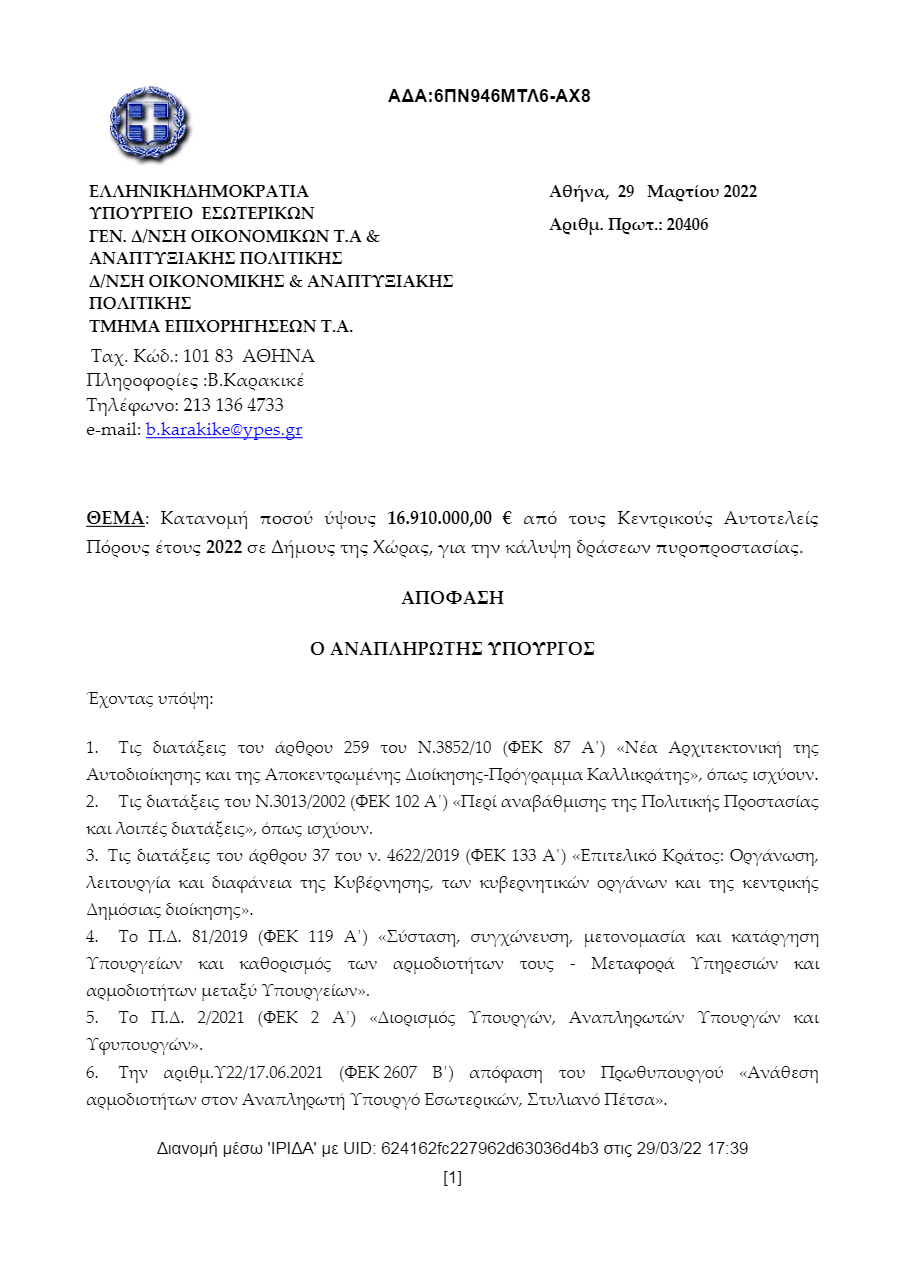 Με την 20406 Απόφαση της 29ης Μαρτίου 2022, την οποία υπογράφει ο Αναπληρωτής Υπουργός Εσωτερικών, κατανεμήθηκαν 16.910.000 € από τους Κεντρικούς Αυτοτελείς Πόρους του 2022, στους Δήμους της χώρας για την κάλυψη δράσεων πυροπροστασίας.