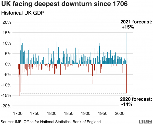 Η Τράπεζα της Αγγλίας προειδοποίησε ότι η πανδημία του κοροναϊού θα ωθήσει την οικονομία του Ηνωμένου Βασιλείου προς τη βαθύτερη ύφεση που έχει καταγραφεί, εδώ και πάνω από 300 χρόνια πριν σημειωθεί ανάκαμψη το 2021.