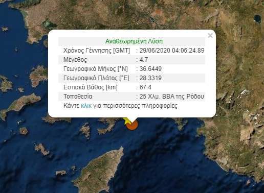 Το επίκεντρο εντοπίζεται 25 χλμ. βορειο-βορειοανατολικά της Ρόδου.