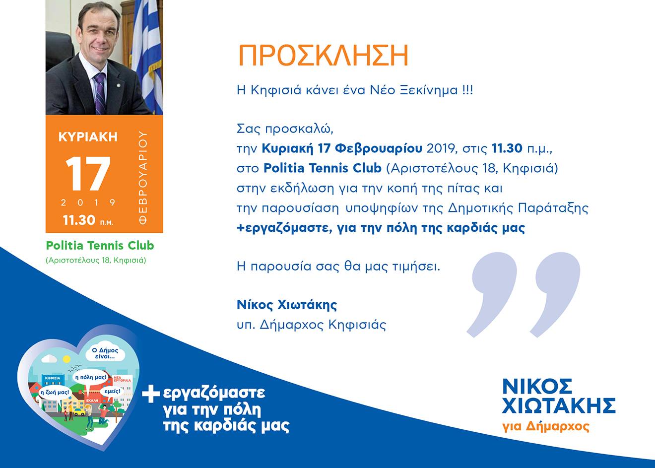 «Την Κυριακή, μαζί με τους πολίτες της Κηφισιάς, της Νέας Ερυθραίας και της Εκάλης, κάνουμε ένα νέο ξεκίνημα αισιοδοξίας και ελπίδας για τις πόλεις μας» δηλώνει ο επικεφαλής της ανεξάρτητης αυτοδιοικητικής παράταξης +εργαζόμαστε για την πόλη της καρδιά μας και υποψήφιος δήμαρχος Νίκος Χιωτάκης, με αφορμή την εκδήλωση της κοπής της πρωτοχρονιάτικης βασιλόπιτας, αλλά και της παρουσίασης των υποψηφίων του συνδυασμού.