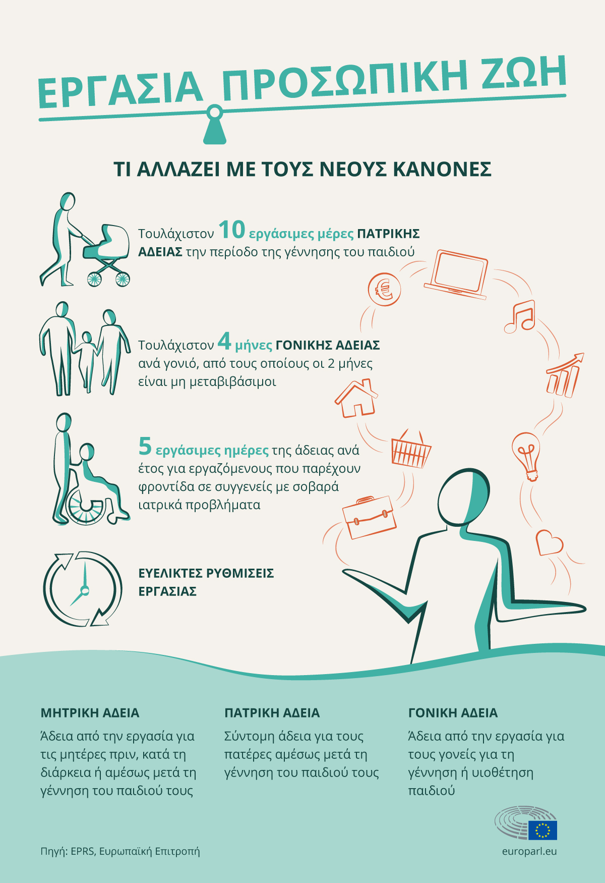 Με την οδηγία 2019 / 1158 της ΕΕ εισήχθη η άδεια πατρότητας, γονική άδεια, άδεια φροντίδας, άδεια απουσίας του πατέρα για την ανατροφή του παιδιού καθώς και πληρωμή του εργαζόμενου πατέρα κατά τη χρήση των αδειών αυτών .