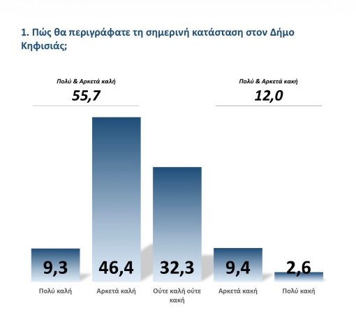 Η συνολική εικόνα του Δήμου αποτιμάται θετικά από την πλειοψηφία των πολιτών: το 55,7% χαρακτηρίζει τη σημερινή κατάσταση «πολύ» ή «αρκετά καλή», έναντι μόλις 12% που τη βλέπει αρνητικά. Το εύρημα αυτό υποδηλώνει ότι, παρά τα υπαρκτά προβλήματα της καθημερινότητας, η γενική εικόνα της πόλης διατηρεί θετικό πρόσημο.