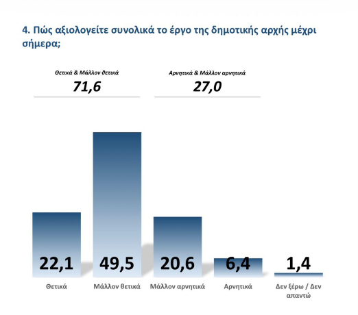 Αντίστοιχα υψηλά είναι και τα ποσοστά αποδοχής του έργου της δημοτικής αρχής, με το 71,6% να το αξιολογεί «θετικά» ή «μάλλον θετικά», έναντι 21,7% που εκφράζει αρνητική άποψη.