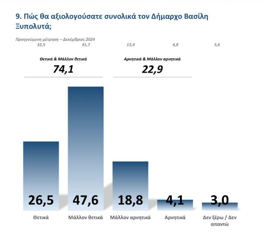 Συνολικά, η εικόνα του Βασίλη Ξυπολυτά αξιολογείται θετικά από το 74,1% των πολιτών, με το 22,9% να διατηρεί αρνητική άποψη.