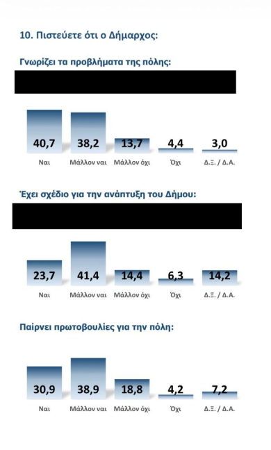 Ιδιαίτερο ενδιαφέρον παρουσιάζουν τα στοιχεία που αφορούν το πρόσωπο του δημάρχου. Το 78,9% των ερωτηθέντων θεωρεί ότι γνωρίζει τα προβλήματα της πόλης, ενώ το 65,1% εκτιμά ότι διαθέτει σχέδιο για την ανάπτυξη του Δήμου. Παράλληλα, το 69,8% αναγνωρίζει ότι αναλαμβάνει πρωτοβουλίες, στοιχείο που ενισχύει την εικόνα ενός ενεργού και παρεμβατικού δημάρχου.