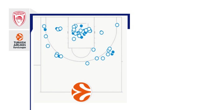 Ο Ολυμπιακός έδειξε να δυσκολεύεται κόντρα στην επιθετική άμυνα της Βιλερμπάν κάτι που απεικονίζεται στο γράφημα που δείχνει το από πού μπόρεσε και βρήκε σουτ. Η μονοδιάστατη τακτική επιλογή του post feed δεν μπόρεσε να κρατήσει για πολύ και οι κόκκινοι δεν δημιουργούσαν λύσεις από μέση απόσταση λόγω της φτωχής διαχείρισης από την μεριά των γκαρντ όταν βρέθηκαν υπό πίεση.