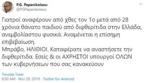 Με δεδομένο ότι πρόκειται για το πρώτο κρούσμα της μολυσματικής αυτής νόσου, και μάλιστα θανατηφόρο, που καταγράφεται τις τελευταίες τρεις δεκαετίες στη χώρα μας, γίνεται αντιληπτή η κρισιμότητα της κατάστασης στο πεδίο των εμβολιασμών.