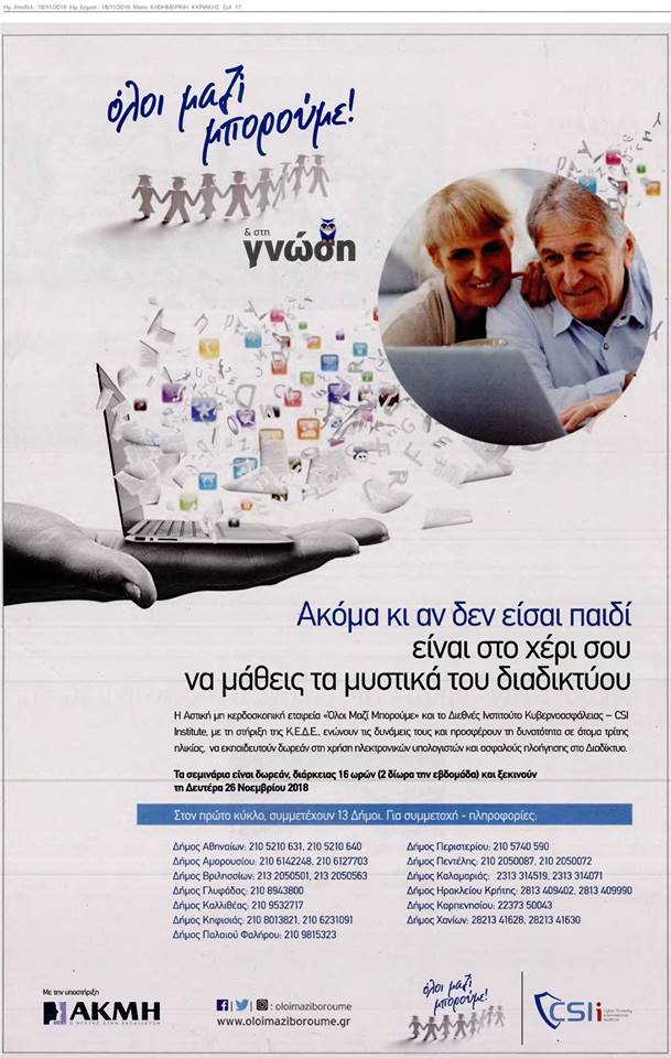 Ο Δήμος Κηφισιάς συμμετέχει στο πρόγραμμα του “Ολοι μαζί μπορούμε και στη γνώση” σε συνεργασία με το Διεθνές Ινστιτούτο Κυβερνοασφάλειας του Μανώλη Σφακιανάκη, προκειμένου να δοθεί αυτή η δυνατότητα σε άτομα τρίτης ηλικίας και να εκπαιδευτουν στο χειρισμό των ηλεκτρονικών υπολογιστών.