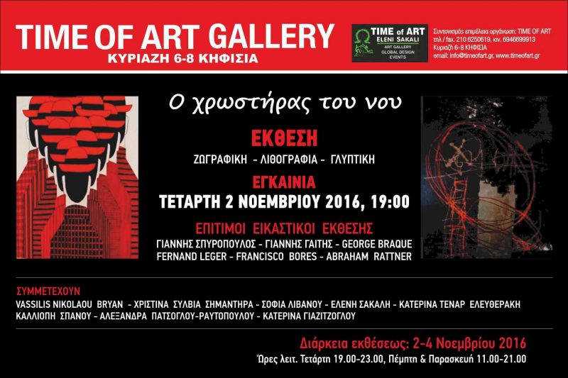 Η παρουσια σας χαρα μας στην Αίθουσα Τέχνης Time of Art gallery την Τετάρτη 2 Νοεμβρίου & ώρα 19.00 – 23.00 στα εγκαίνια της ομαδικής έκθεσης με τίτλο ‘ Ο χρωστηρας του νου ’