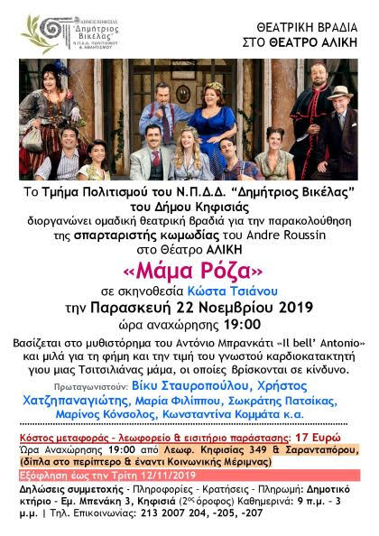 διοργανώνει ομαδική θεατρική βραδιά για την παρακολούθηση της σπαρταριστής κωμωδίας του Andre Roussin στο Θέατρο ΑΛΙΚΗ