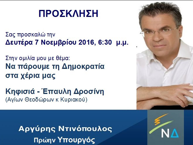 ΕΚΔΗΛΩΣΕΙΣΤΟΠΙΚΑ Ομιλία του Αργύρη Ντινόπουλου στην Κηφισιά Από john - 3 Νοεμβρίου 2016 0 281 FacebookTwitterPinterestWhatsApp Ανοιχτή πρόσκληση του πρώην υπουργού Αργύρη Ντινόπουλου στην Έπαυλη Δροσίνη (Αγίων Θεοδώρων και Κυριακόυ ) στην Κηφισιά. Ομιλία με θέμα <<Να πάρουμε τη δημοκρατία στα χέρια μας >> Δευτέρα 7 Νοεμβρίου, ώρα έναρξης 18.30