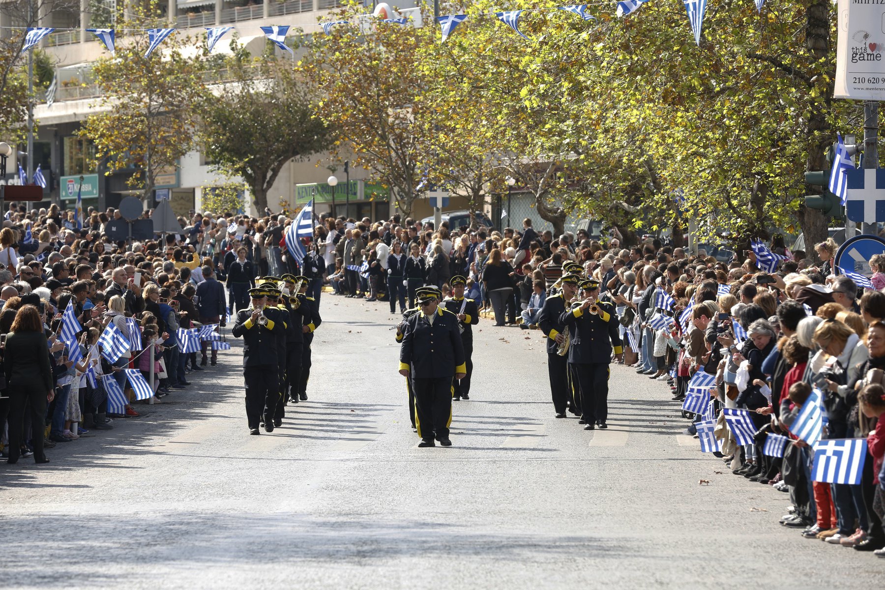 Με υπερηφάνεια για το «ΟΧΙ» του ΄40 οι μαθήτριες και οι μαθητές των Δημοτικών, των Γυμνασίων, των Λυκείων καθώς και οι πρόσκοποι, οι οδηγοί και τα αθλητικά σωματεία του Δήμου Κηφισιάς παρήλασαν ανήμερα της εθνικής επετείου τιμώντας τους ήρωες του Έπους.