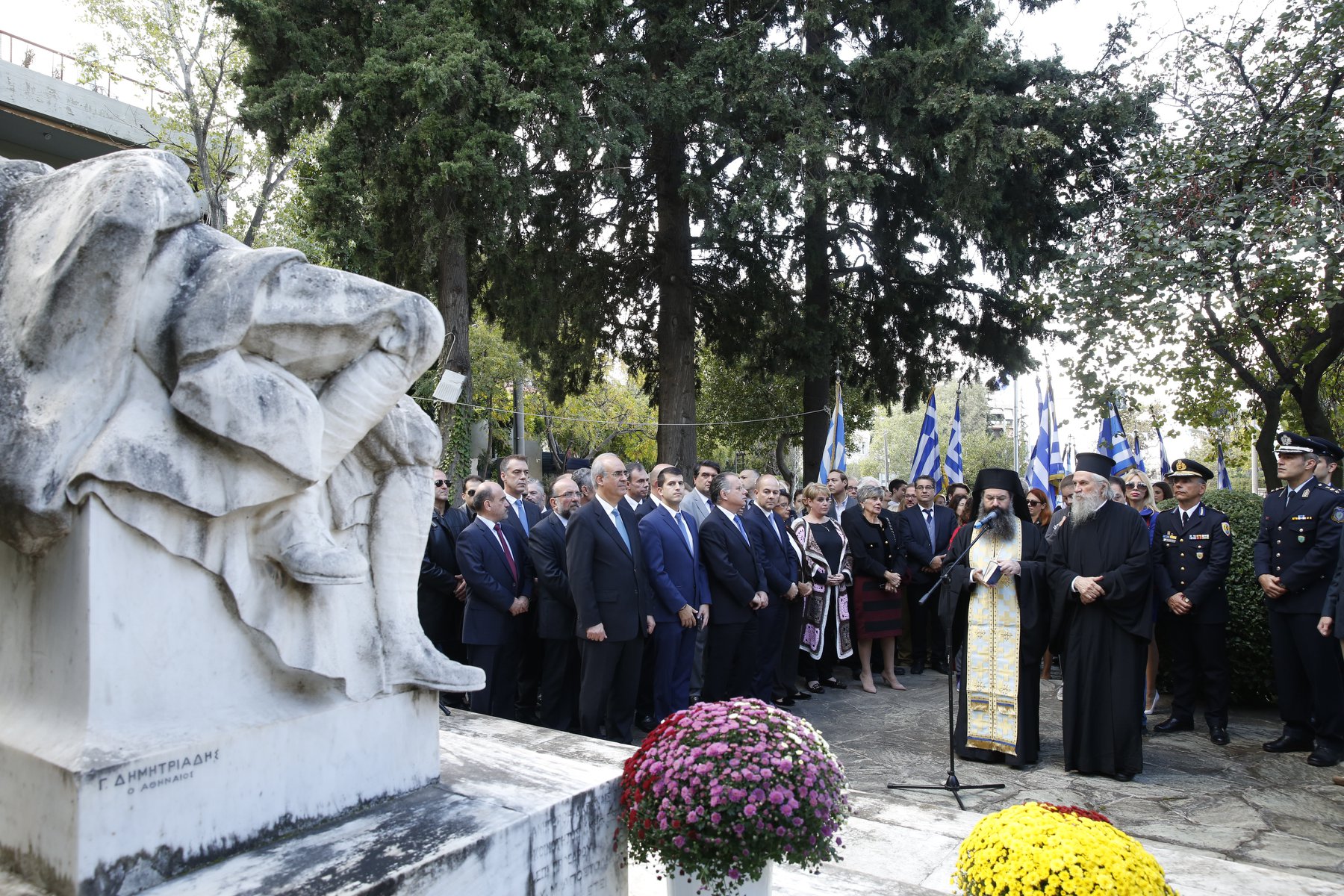 Μετά τη Δοξολογία πραγματοποιήθηκε επιμνημόσυνη δέηση στο Μνημείο Πεσόντων στην Κηφισιά και κατάθεση στεφάνων από τον δήμαρχο, Γιώργο Θωμάκο, εκπροσώπους της Περιφέρειας, της Αστυνομίας, της Πυροσβεστικής και των πολιτικών κομμάτων.