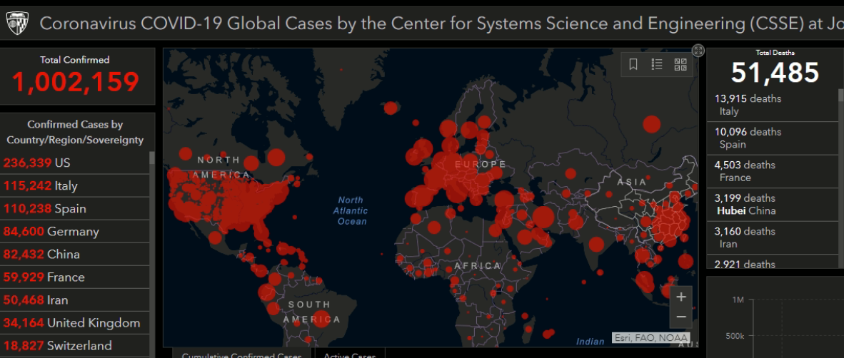 Σύμφωνα με την καταμέτρηση του πανεπιστήμιου Johns Hopkins, τα κρούσματα παγκοσμίως είναι 1.002.519 και οι θάνατοι 51.355.