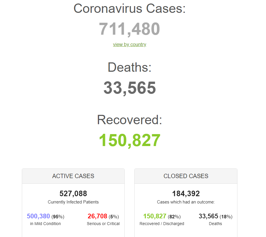 Ο κοροναϊός «σκεπάζει» τον πλανήτη: Πάνω από 700.000 κρούσματα – Ξεπερνούν τις 33.000 οι νεκροί