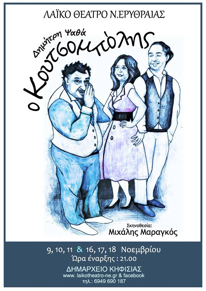 Το Λαϊκό Θέατρο Νέας Ερυθραίας παρουσιάζει το θεατρικό έργο του Δημήτρη Ψαθά «Ο Κουτσομπόλης» σε σκηνοθεσία Μιχάλη Μαραγκού. Σκηνικά κοστούμια: Μαρία Ποθητού, Μουσική Επιμέλεια: Κάτια Τραπελίδη, Φωτισμοί : Θανάσης Ντούλας