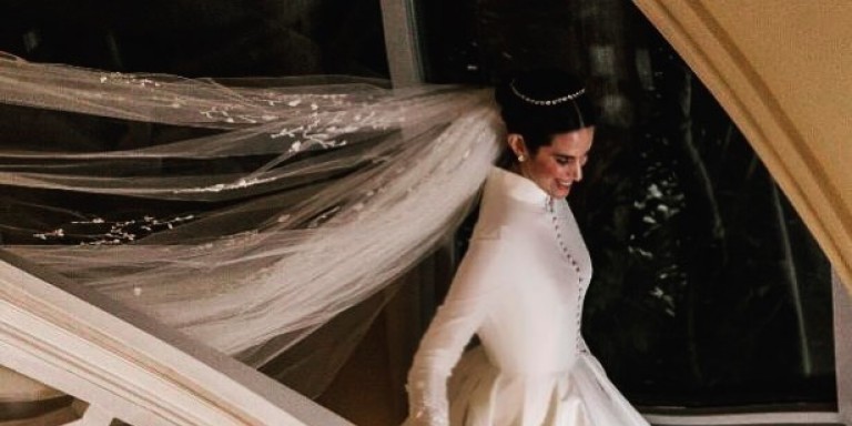 Για τον καθολικό γάμο, επιλέχθηκε ένα νυφικό σε μια πιο μοντέρνα και ίσια γραμμή, με όγκο στα μανίκια.