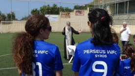 Ο Πάτερ Κωνσταντίνος ευστόχησε από τα έντεκα βήματα στον αγιασμό του Περσέα Σύρου, έχοντας απέναντι του τη νεαρότερη αθλήτρια του συλλόγου.