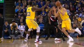 Ασυνεννοησία υπήρξε μεταξύ Ντρέιμοντ Γκριν και Κλέι Τόμπσον στην επίθεση των Ουόριορς, με τον πρώτο να πετά τη μπάλα στο πρόσωπο του δεύτερου.