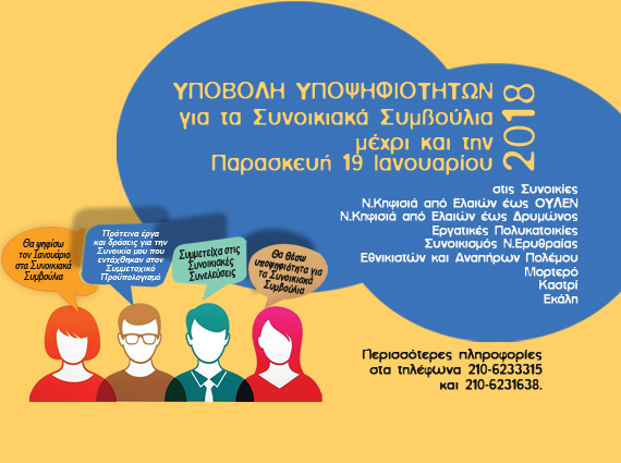 Κατάθεση υποψηφιοτήτων στην Εκλογική Επιτροπή για τα Συνοικιακά Συμβούλια. (Διονύσου 73 και Γορτυνίας, από Δευτέρα έως Παρασκευή 8.30-15.30)