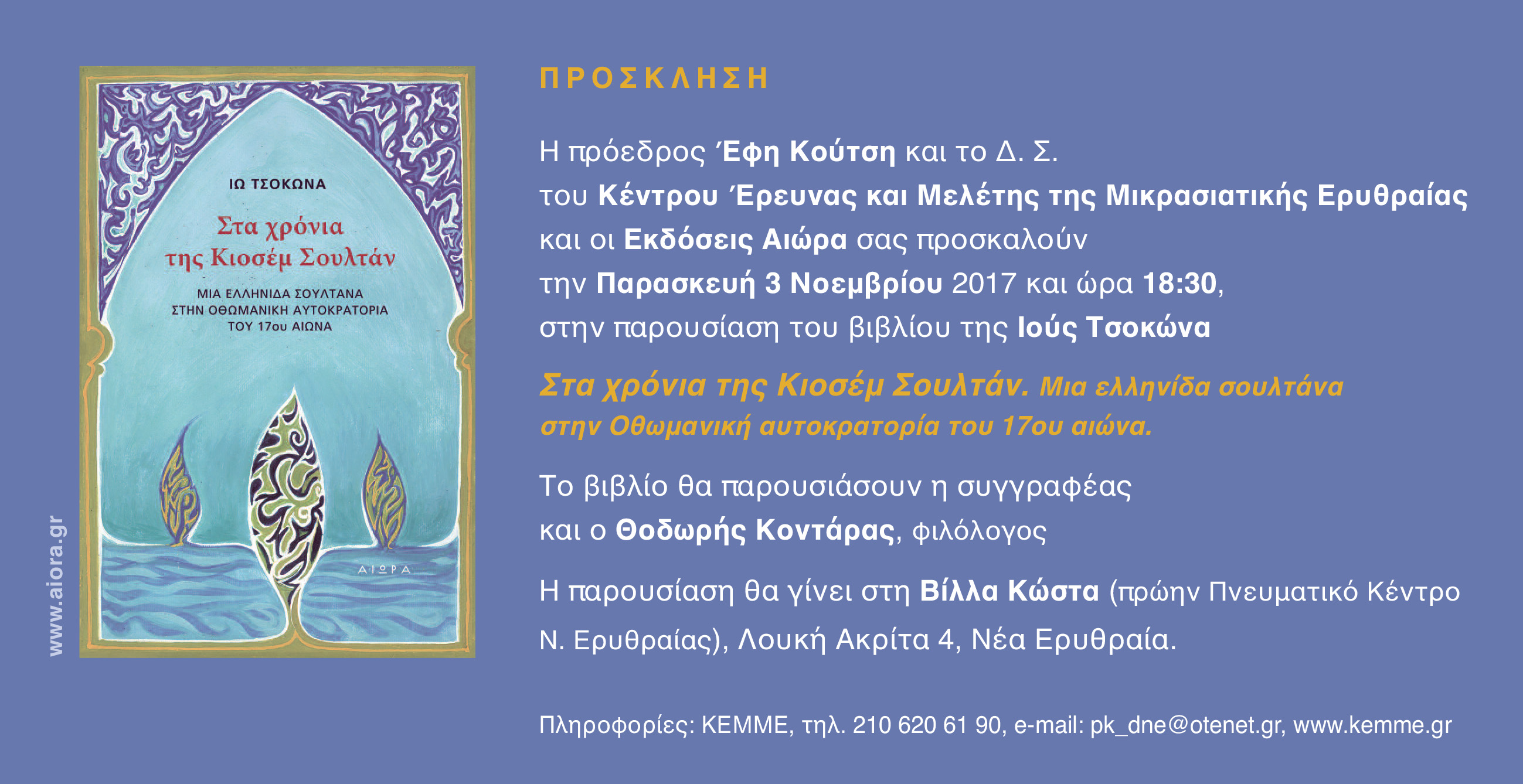 Το βιβλίο «Στα χρόνια της Κιοσέμ Σουλτάν. Μια Ελληνίδα σουλτάνα στην Οθωμανική αυτοκρατορία του 17ου αιώνα» της Ιούς Τσοκώνα, παρουσιάζουν την Παρασκευή 3 Νοεμβρίου 2017 και ώρα 18.30 η συγγραφέας και ο φιλόλογος Θοδωρής Κοντάρας στο Πνευματικό Κέντρο Νέας Ερυθραίας «Βίλα Κώστα» (Λουκή Ακρίτα 4 Νέα Ερυθραία).