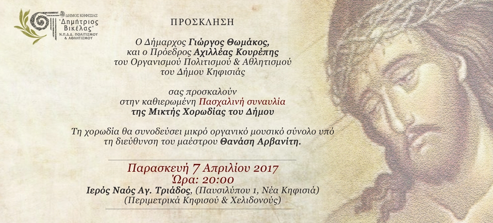 Στο πλαίσιο των Άγιων Ημερών του Πάσχα, ο Οργανισμός Πολιτισμού & Αθλητισμού του Δήμου Κηφισιάς διοργανώνει την Παρασκευή 7 Απριλίου και ώρα: 20:00, την καθιερωμένη Πασχαλινή συναυλία της Μικτής Χορωδίας του Δήμου Κηφισιάς με κλασικές και εκκλησιαστικές μελωδίες των χορωδών και μουσικών της Χορωδίας, υπό τη διεύθυνση του καταξιωμένου μαέστρου Θανάση Αρβανίτη στον Ιερό Ναό Αγ. Τριάδος στην Νέα Κηφισιά. (Παυσιλύπου 1, & Κηφισού).