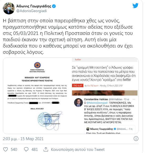 «Η βάπτιση στην οποία παρευρέθηκα χθες ως νονός, πραγματοποιήθηκε νομίμως κατόπιν αδείας που εξέδωσε στις 05/03/2021 η Πολιτική Προστασία όταν οι γονείς του παιδιού έκαναν την σχετική αίτηση.»