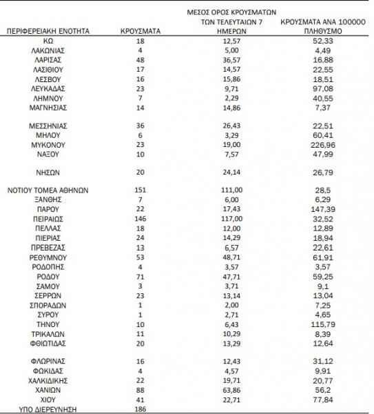 Τέλος, 186 κρούσματα βρίσκονται υπό διερεύνηση.