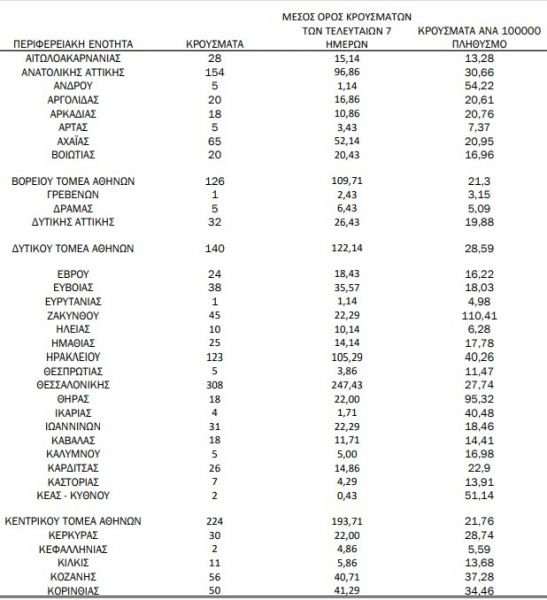 Ακόμα, 65 κρούσματα καταγράφει η Αχαΐα, 56 η Κοζάνη, 50 η Κορινθία και 71 η Ρόδος.