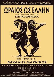 Από 3 Φεβ- 26 Φεβ, κάθε Παρ. Σαβ. Κυρ. και ώρα 9:00 στο Δημοτικό Θέατρο Νέας Ερυθραίας (Κερκύρας & Δρυμπέτη), το Λαϊκό Θέατρο με τη Θεατρική Παράσταση “Ωραίος ως ΄Ελλην” παρουσιάζει 4 μονόπρακτα του Κ. Μουρσελά: “Διακοπή ρεύματος” , “Η απαρηγόρητη χήρα” , “Η μπουχάρα” και “Το δίκανο” όπου βλέπουμε ξεκάθαρα την παθογένεια της σύγχρονης ελληνικής κοινωνίας.