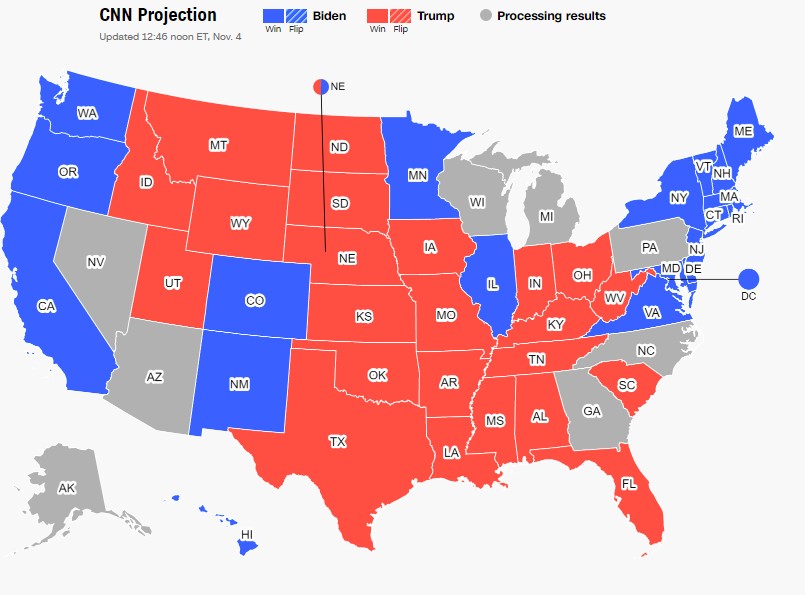 Μέχρι στιγμής, ο Δημοκρατικός Τζο Μπάιντεν προηγείται σε αριθμό μεγάλων εκλεκτόρων, με 238, ενώ ο απερχόμενος Ρεπουμπλικάνος πρόεδρος έχει εξασφαλίσει 213. Χρειάζονται 270 για να κερδίσει κάποιος τον Λευκό Οίκο.