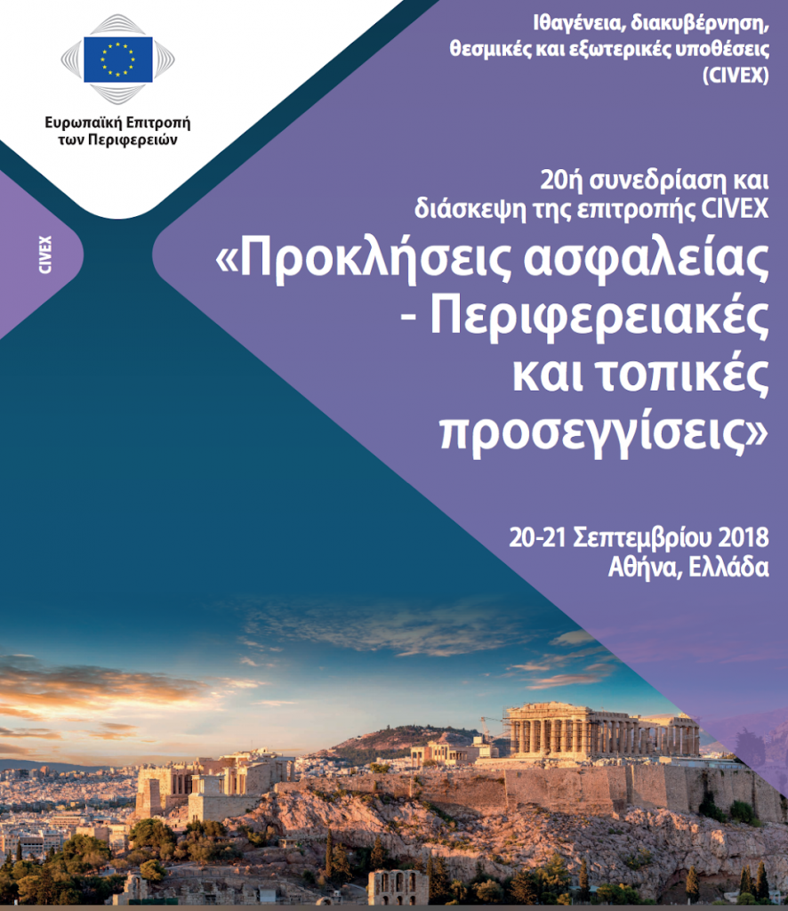 Πραγματοποιείται την Πέμπτη 20 και την Παρασκευή 21 Σεπτεμβρίου στην Αθήνα, στο ξενοδοχείο DIVANI CARAVEL, η 20η συνεδρίαση και διάσκεψη της Ευρωπαικής Επιτροπής των Περιφερειών «Ιθαγένεια, Διακυβέρνηση, Θεσμικές και Εξωτερικές Υποθέσεις» (CIVEX) με θέμα «Προκλήσεις ασφάλειας πολιτών – Περιφερειακές και τοπικές προσεγγίσεις».