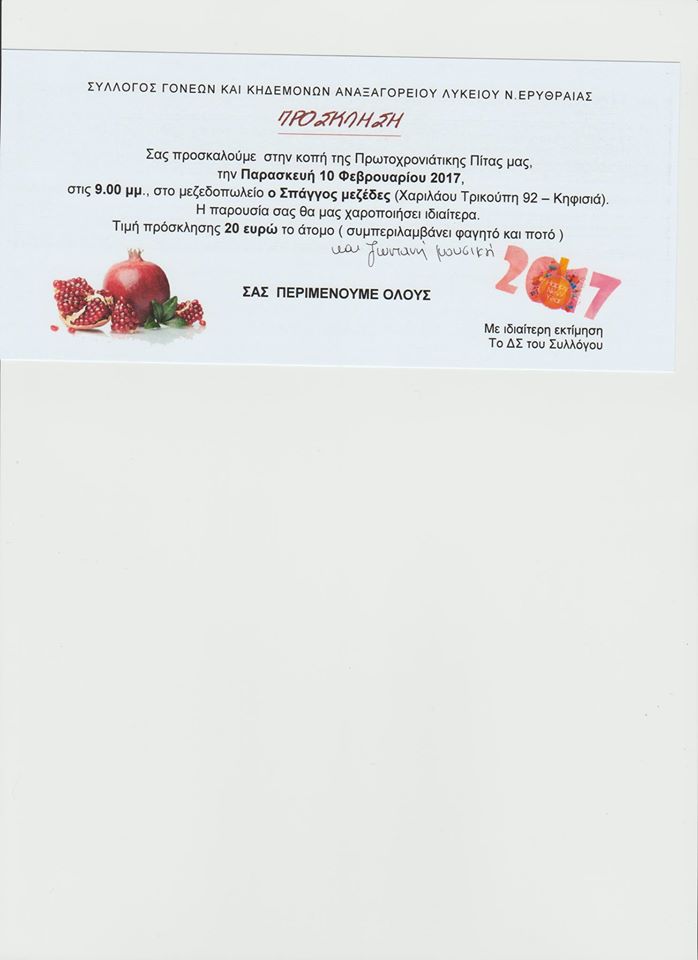 ΕΞΟΔΟΣ Πρόσκληση- Εκδήλωση από το Σύλλογο Γονέων Αναξαγορείου Λυκείου Νέας Ερυθραίας. Από john - 10 Φεβρουαρίου 2017 0 285 FacebookTwitterPinterestWhatsApp Ελάτε να γιορτάσουμε μαζί το 2017, να πιούμε να φάμε και να γνωριστούμε καλύτερα .Για προσκλησεις επικοινωνήστε με τα μέλη του Δ.Σ , 20 ευρώ το άτομο , με φαγητό , ποτό και ζωντανή μουσική