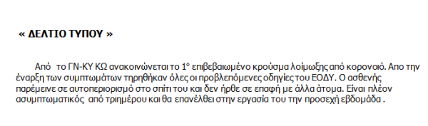 Από το ΓΝ-ΚΥ ΚΩ ανακοινώνεται το 1ο επιβεβαιωμένο κρούσμα λοίμωξης από κορονοϊό. Απο την έναρξη των συμπτωμάτων τηρήθηκαν όλες οι προβλεπόμενες οδηγίες του ΕΟΔΥ. Ο ασθενής παρέμεινε σε αυτοπεριορισμό στο σπίτι του και δεν ήρθε σε επαφή με άλλα άτομα. Είναι πλέον ασυμπτωματικός από τριημέρου και θα επανέλθει στην εργασία του την προσεχή εβδομάδα .