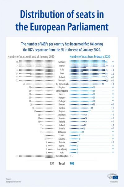 Από την 1η Φεβρουαρίου, το Ευρωπαϊκό Κοινοβούλιο θα έχει 705 έδρες, σε σύγκριση με τις 751 (ο μέγιστος επιτρεπόμενος αριθμός από τις συνθήκες της ΕΕ) που είχε πριν από την αποχώρηση του Ηνωμένου Βασιλείου από την ΕΕ στις 31 Ιανουαρίου 2020.