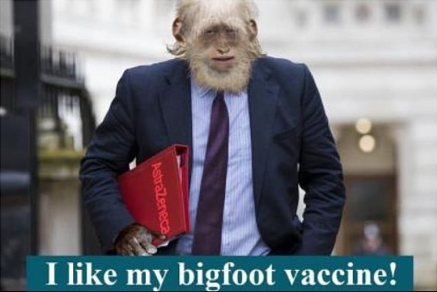 Μία από τις επίμαχες εικόνες δείχνει τον Μπόρις Τζόνσον να διασχίζει την Ντάουνινγκ Στριτ, με το πρόσωπο του Βρετανού πρωθυπουργού να έχει υποστεί επεξεργασία με φώτοσοπ ώστε να μοιάζει… με γέτι. «Μου αρέσει το εμβόλιο…