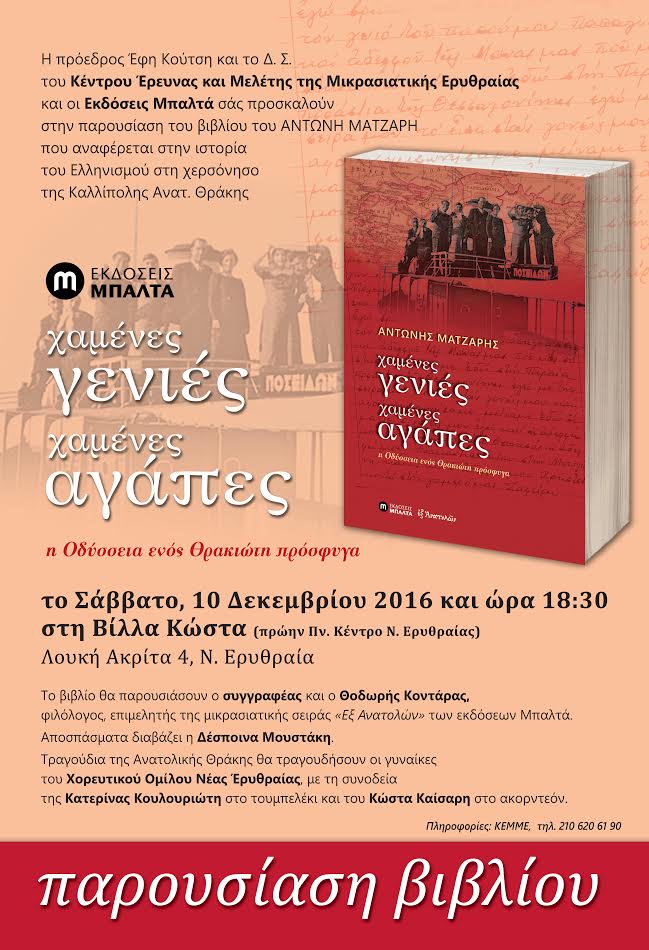 Το απόγευμα στις 18.30 θα μπορούσατε να επισκεφτείτε το ΚΕΜΕ στη Νέα Ερυθραία σε μια πολύ ενδιαφέρουσα βιβλιοπαρουσίαση. <<Χαμένες γενιές χαμένες αγάπες>>