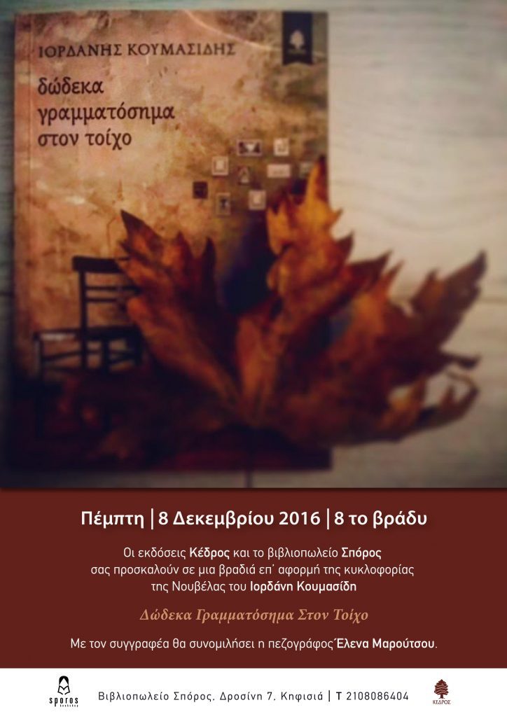 Αν προτιμάτε κάτι ποιο ήρεμο στις 20.00 στο βιβλιοπωλείο Σπόρος στην οδό Δροσίνη θα γίνει παρουσίαση της Νουβέλας του Ιορδάνη Κουμασίδη <<δώδεκα γραμματόσημα στον τοίχο>>. Με το συγγραφέα θα μιλήσει η πεζογράφος Έλενα Μαρούτσου.